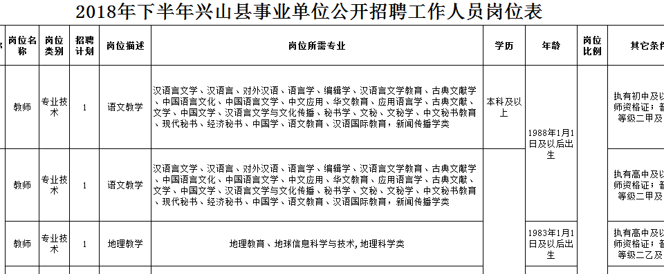 每个岗位的具体招聘条件见《2018年下半年兴山县事业单位公开招聘工作人员岗位表》(附件1)。