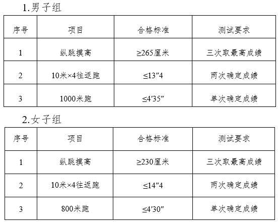 体能测评项目及合格标准如下: