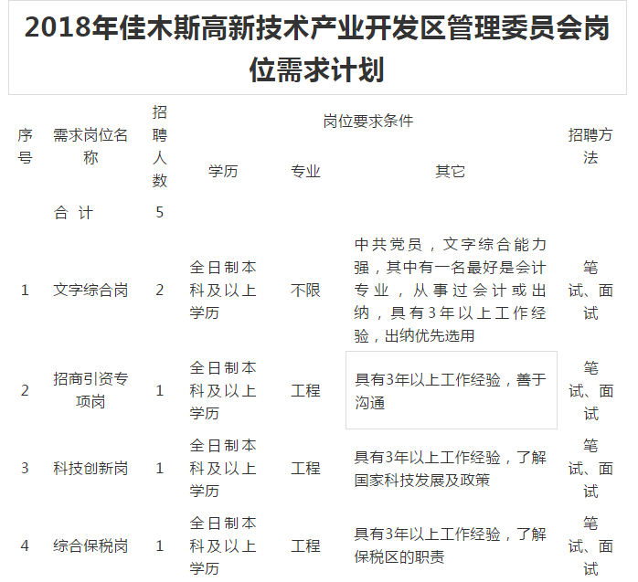 1、2018年佳木斯高新技术产业开发区管理委员会岗位需求计划