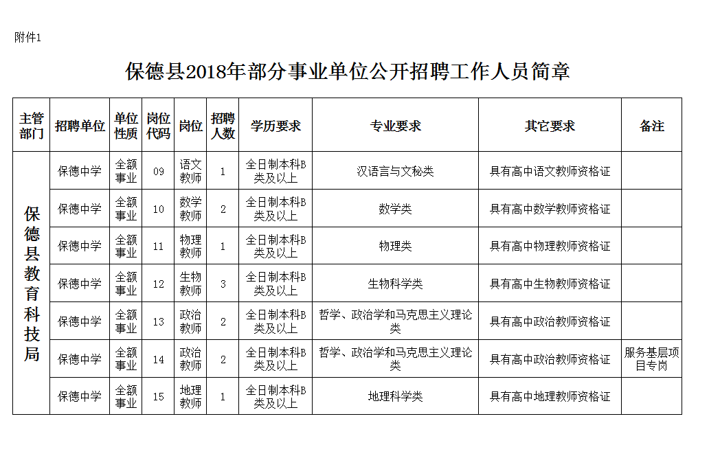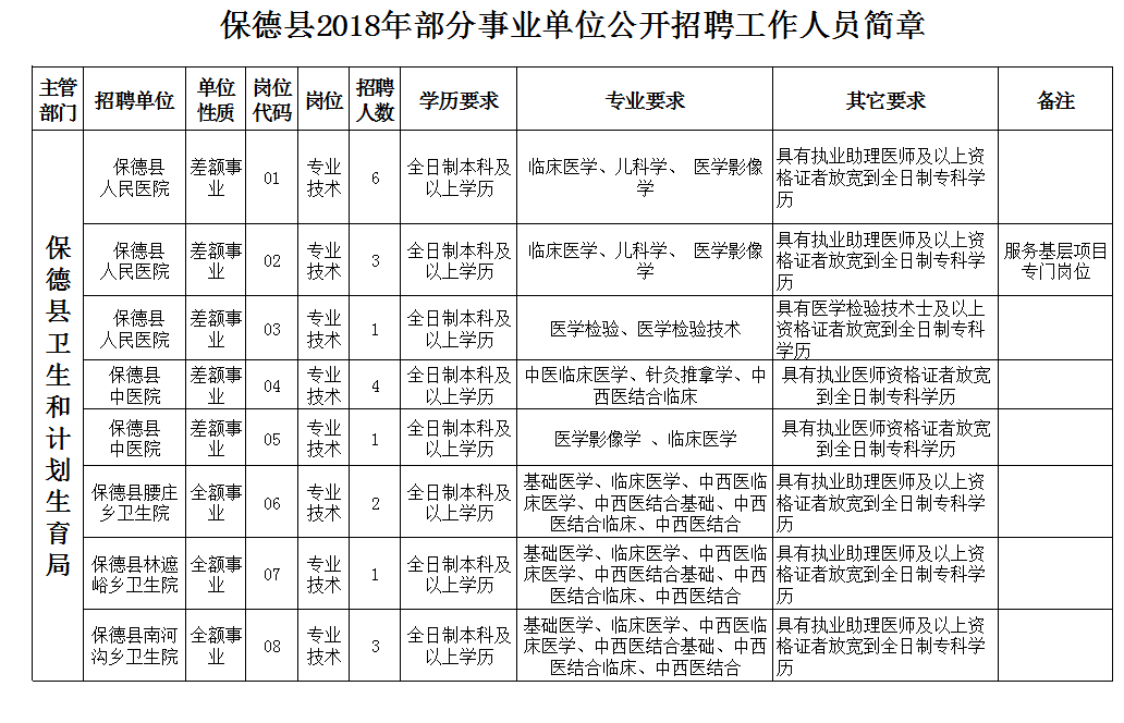本次拟为差额事业单位保德县人民医院招聘10名、保德县中医院招聘5名;拟为全额事业单位保德县腰庄乡卫生院招聘2名、保德县林遮峪乡卫生院招聘1名、保德县南河沟乡卫生院招聘3名、保德中学招聘12名、保德县职业中学招聘5名。招聘的具体岗位、名额、资格条件等详见《保德县2018年部分事业单位公开招聘工作人员简章》。