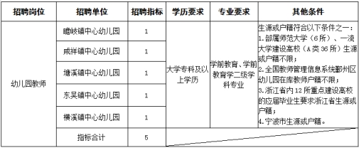 为推进区域教育人才建设,根据鄞州区事业单位公开招聘有关规定,决定面向社会公开招聘幼儿园事业编制教师5名。现就有关事项公告如下: