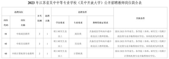 4.具备《2023年江苏省吴中中等专业学校(吴中开放大学)公开招聘教师岗位简介表》(见附件1)中要求的资格条件,岗位简介表中对招聘岗位基本条件和其他资格条件另有规定的从其规定。