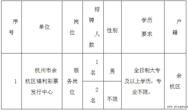 杭州市余杭区福利彩票发行中心现因工作需要,面向全区公开招聘工作人员,其性质为自聘人员,具体事项公告如下: