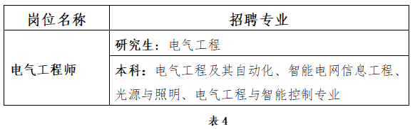 此岗位还需具有下列专业(详见表4)的全日制大学本科及以上学历,具有建筑电气(建筑智能化)、电机与电器或照明器具、电光源专业的中级工程师及以上专业技术资格(须提供由人社部门发证的专业技术资格证书)。