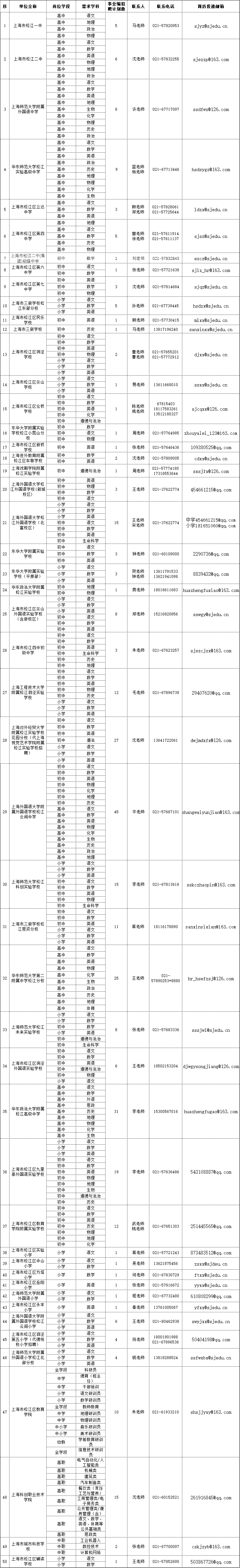 上海市松江区中小学(含中高职)事业编教师和储备教师,具体需求类型、岗位名称及招聘计划数等信息见附件。