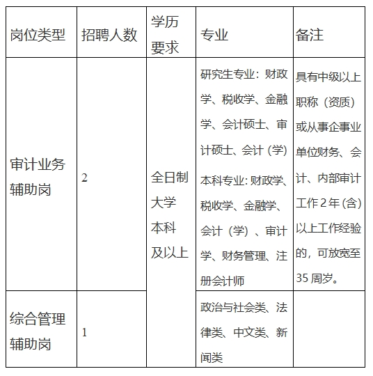 因工作需要,抚州市审计局计划面向社会公开招聘3名辅助性岗位工作人员。现将有关事项公告如下: