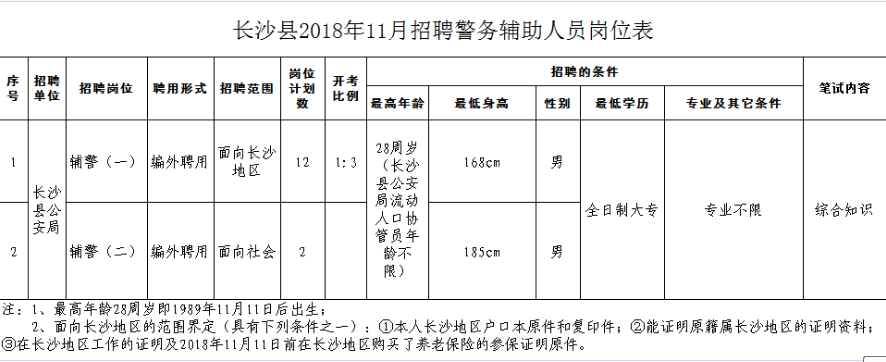 五、招聘岗位、人数及具体条件见附件《长沙县2018年11月招聘警务辅助人员岗位表》。