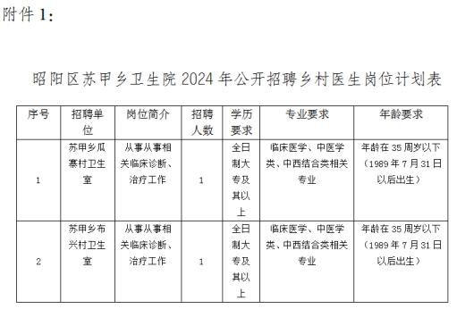 具体招聘岗位、职数详见《昭阳区苏甲乡卫生院2024年公开招聘乡村医生岗位设置计划表》(附件1)。