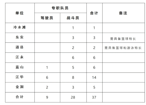 岗位要求:战斗员具备一定的体能素质,篮球、游泳特长优先;驾驶员取得B2以上驾驶证,驾龄满2年并具备一定的驾驶基础,国家综合性消防救援队伍退出人员不受年龄限制。