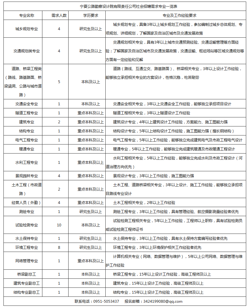 为了进一步扩大经营规模、开拓市场,落实“人才强企”的治企理念,进一步革新用人机制,为公司长期发展提供人才保障和技术支持,宁夏公路勘察设计院有限责任公司决定面向社会公开招聘以下专业: