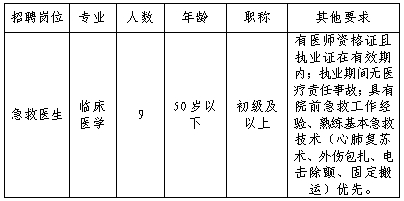 有医师资格证且执业证在有效期内;执业期间无医疗责任事故;具有院前急救工作经验、熟练基本急救技术(心肺复苏术、外伤包扎、电击除颤、固定搬运)优先。 |