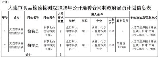 1.《大连市食品检验检测院2025年公开选聘合同制政府雇员计划信息表》