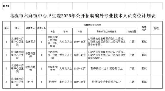 详见《北流市六麻镇中心卫生院2025年公开招聘编外专业技术人员计划表》(附件1)。