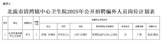 详见《北流市清湾镇中心卫生院2025年公开招聘编外人员计划表》(附件1)。