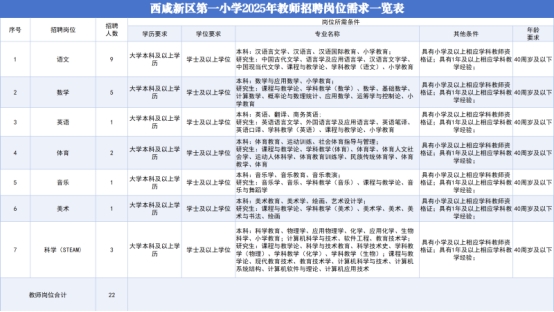 西咸一小:语文9人、数学5人、英语1人、体育2人、音乐1人、美术1人、科学(STEAM)3人;