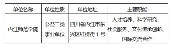 根据《事业单位人事管理条例》《事业单位公开招聘人员暂行规定》和《四川省事业单位公开招聘工作人员实施办法》等有关规定,经四川省教育厅备案,我单位拟面向社会公开招聘13名工作人员。现将公开招聘有关事项公告如下(本公告同时在四川省人力资源和社会保障厅官网[http://rst.sc.gov.cn,下同]“人事考试”专栏、四川省教育厅官网[http://edu.sc.gov.cn,下同]和内江师范学院官网[http://www.njtc.edu.cn/下同]上发布)。