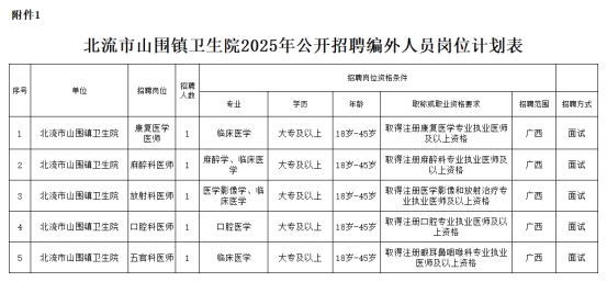 详见《北流市山围镇卫生院2025年公开招聘编外人员岗位计划表》(附件1)。