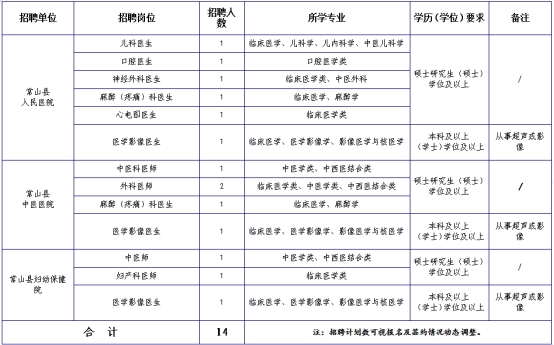 本次招聘的常山县卫健系统医疗卫生单位共3家,推出岗位13个,共招聘人员14名。具体招聘事宜详见表格。