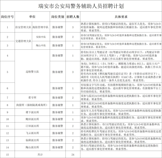 本次计划招聘警务辅助人员24名,具体招聘计划和岗位要求详见图片。