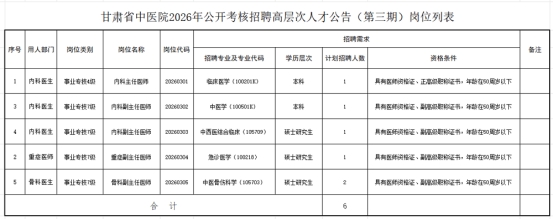 8. 具备岗位要求的其他条件(见附件1:《甘肃省中医院2026年公开考核招聘高层次人才公告(第三期)岗位列表》,以下简称“岗位列表”)。