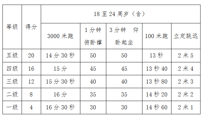 体能考核科目为3000米跑、1分钟俯卧撑、3分钟仰卧起坐、100米跑、立定跳远五个科目。《体能测试考核标准》(详见附件1)。