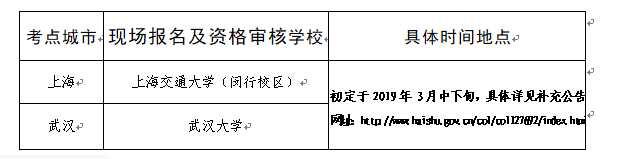 报考人员也可前往上海、武汉2个地区现场报名。现场报名及资格审核时间、地点: