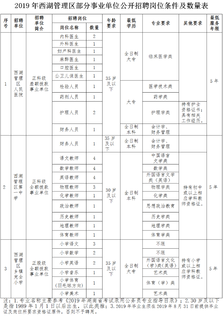 2019年西湖管理区部分事业单位公开招聘岗位条例及数量表