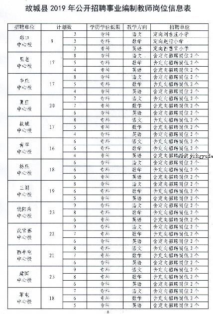 2.本次公开招聘设置部分岗位定向招聘“服务基层四项目人员”是指:2019年度当年服务期满的“选聘高校毕业生到村任职工作(含2016年及以前选聘的任职3年以上、考核称职以.上的在岗大学生村官)”、“农村义务教育阶段学校教师特设岗位计划”、三支一扶计划”、大学生志愿服务西部计划”人员。开考比例不受报名人数限制。此定向岗位无人报名或报名者未达到录取条件,则转为普通岗位使用。具体岗位详见附表《故城县2019年公开招聘事业编制教师岗位信息表》。