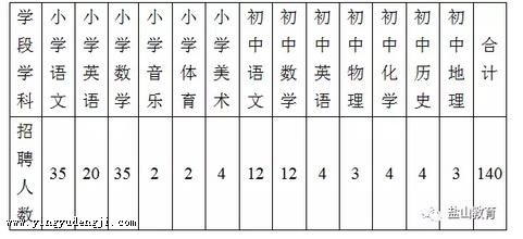 农村中小学教师共140名。岗位及数量如下: