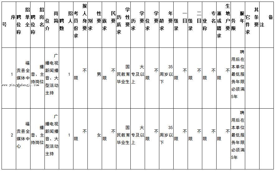 福贡县全媒体中心广播电视播音员岗位2名。具体岗位要求详见下表: