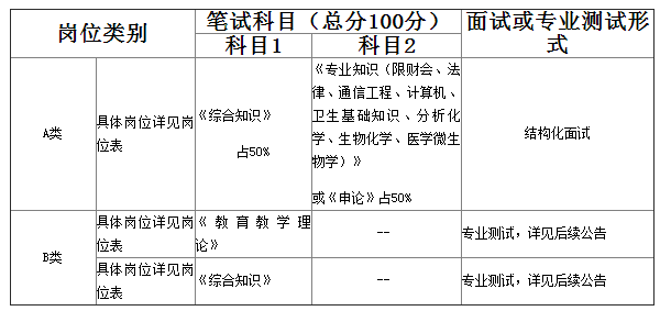 1、笔试工作由市人社部门统一组织,采取闭卷形式进行,考试科目根据岗位类别如下表: