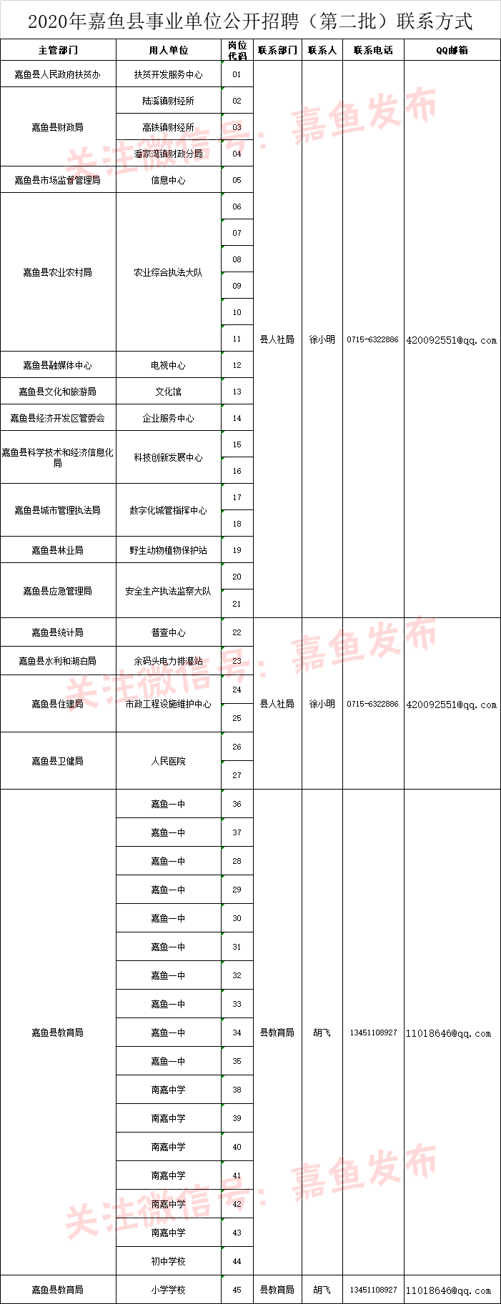本次招聘的具体单位、岗位及资格条件详见《2020年嘉鱼县事业单位公开招聘(第二批)岗位表》(附件1,以下简称《岗位表》)。