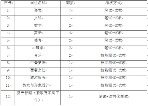 语文、数学、英语、德育、心理学、资产管理(兼政府性采购):由笔试、考核组成(方式为试教或结构化面试);音乐、烹饪(中餐、西餐)、旅游服务、美发与形象设计:由考核(方式为技能测试、试教)组成