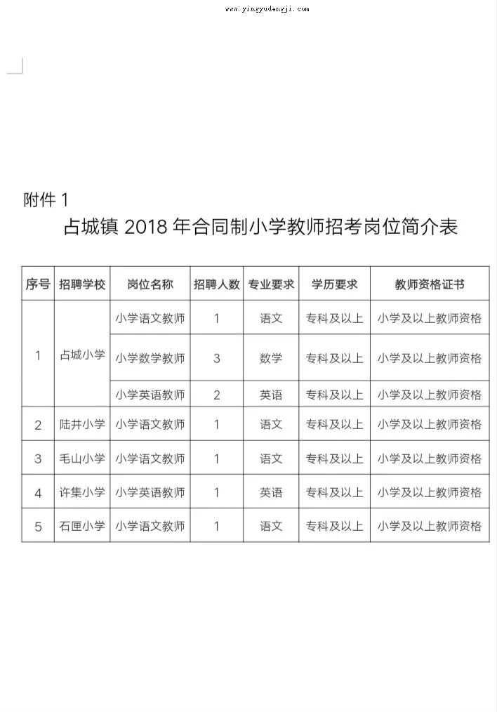 1.占城镇2018年合同制小学教师招考岗位简介表