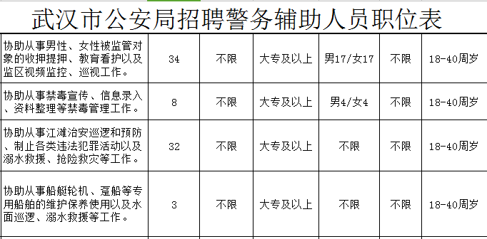 具体的招聘人数、岗位资格条件等详见《武汉市公安局招聘警务辅助人员职位表》,报考人员可登陆武汉人事人才网(www.job98.com)、武汉市公安局“平安武汉”官方微信(pinganwuhan001)以及平安武汉网(www.whga.gov.cn)查询。