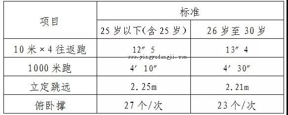 参照《公安机关录用人民警察体能测评项目和标准》组织实施,具体内容为10米×4往返跑、1000米、立定跳远、俯卧撑。