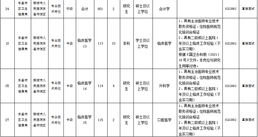 引进优秀人才不设笔试环节,面试具体方式、时间、地点见面试通知单。因疫情防控或其他原因,需要对面试时间做出调整时,将会及时在聊城市人民医院东昌府院区(聊城市东昌府人民医院)官方网站和微信公众号予以公告。