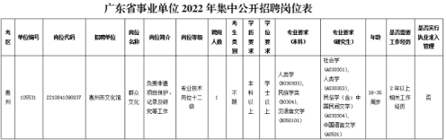根据《广东省事业单位2022年集中公开招聘高校毕业生公告》,惠州市文化广电旅游体育局下属市体育运动学校公开招聘3名专业技术人才,市文化馆公开招聘1名专业技术人才。