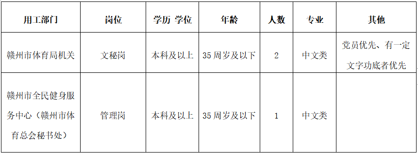 招聘工作按照报名—资格审核—笔试—面试—体检—公示—聘用等程序进行。试用期为2个月,试用合格后,签订劳动合同,实行两年一聘制,录用人员待遇按照赣州市体育局及下属事业单位的相关薪酬规定执行。