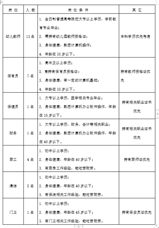 幼儿教师13名、保育员7名、保健员1名、财务1名、厨工4名、清洁2名、门卫1名