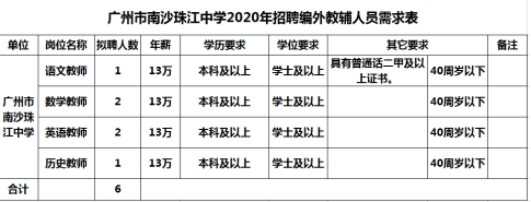2020年公开招聘广州市南沙珠江中学编外教辅人员公告