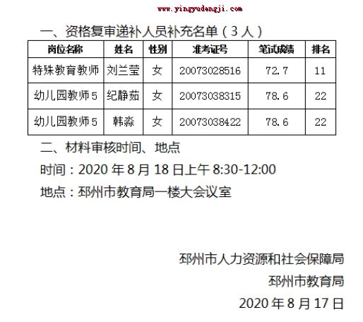 关于2020年邳州市公开招聘教师资格复审递补人员补充公告