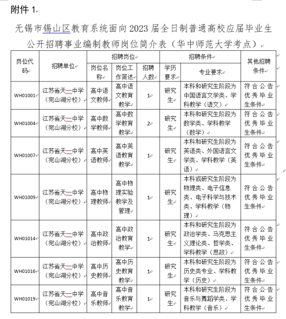 江苏省天一中学公开招聘2023年事业编制教师公告(锡山区校招-华中师大考点)