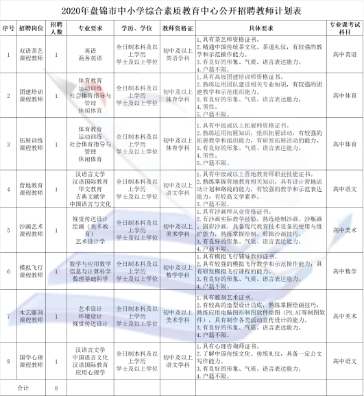 2020年辽宁省盘锦市中小学综合素质教育中心教师招聘计划表