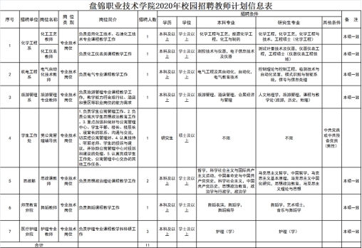 1.《盘锦职业技术学院2020年校园招聘教师计划信息表》