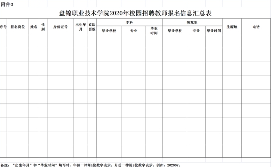 (6)考生需填好《盘锦职业技术学院2020年校园招聘教师报名登记表》(附件2)(面试时打印上交,此表由应聘者本人签字)和《盘锦职业技术学院2020年校园招聘教师报名信息汇总表》(附件3)。