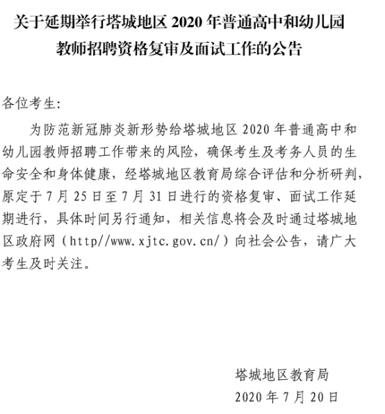 关于延期举行新疆塔城地区2020年普通高中和幼儿园教师招聘资格复审及面试工作的公告