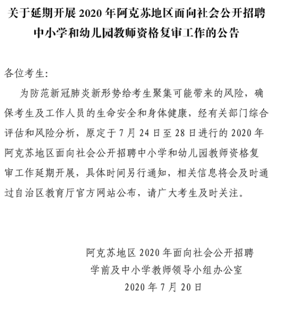 关于延期开展2020年新疆阿克苏地区教师招聘资格复审工作的公告