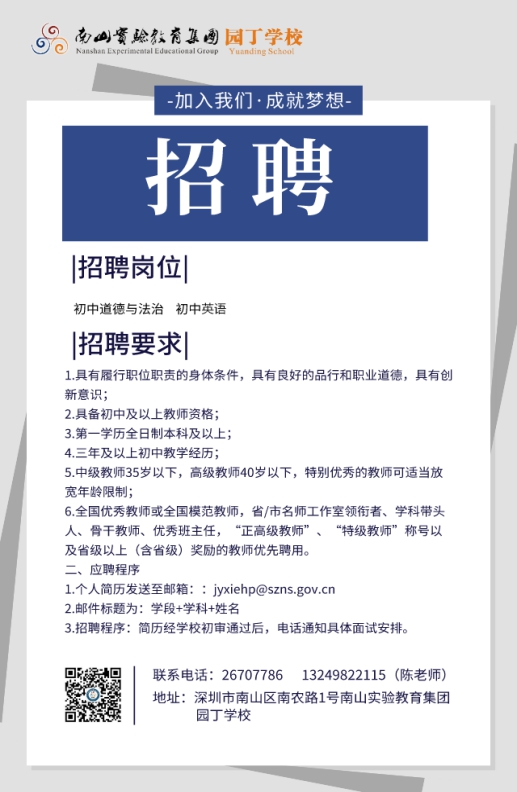 2020年广东省深圳市南山实验教育集团园丁学校教师招聘启事
