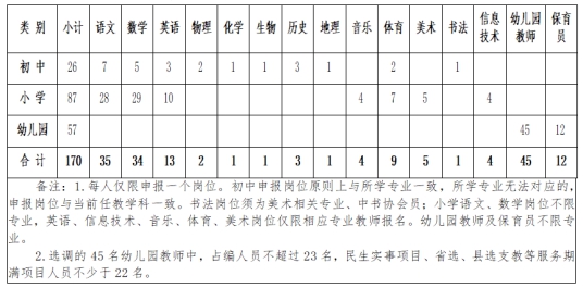 3.学历及资格:城区初中为大专及以上文化程度,具备初级中学及以上教师资格;城区小学为大专及以上文化程度,具备小学及以上教师资格;城区幼儿园为中师及以上文化程度,具备幼儿园及以上教师资格。